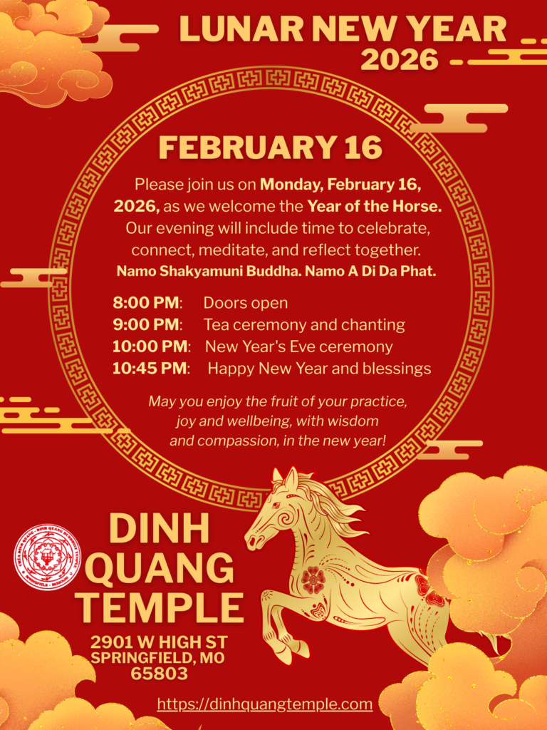 Please join us on Monday, February 16, 2026, as we welcome the Year of the Horse. Our evening will include time to celebrate, connect, meditate, and reflect together. Namo Shakyamuni Buddha. Namo A Di Da Phat.