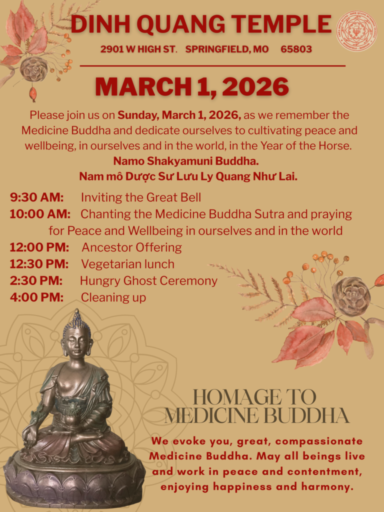 Please join us on Sunday, March 1, 2026, as we remember the Medicine Buddha and dedicate ourselves to cultivating peace and wellbeing, in ourselves and in the world, in the Year of the Horse. Namo Shakyamuni Buddha. Nam mô Dược Sư Lưu Ly Quang Như Lai.